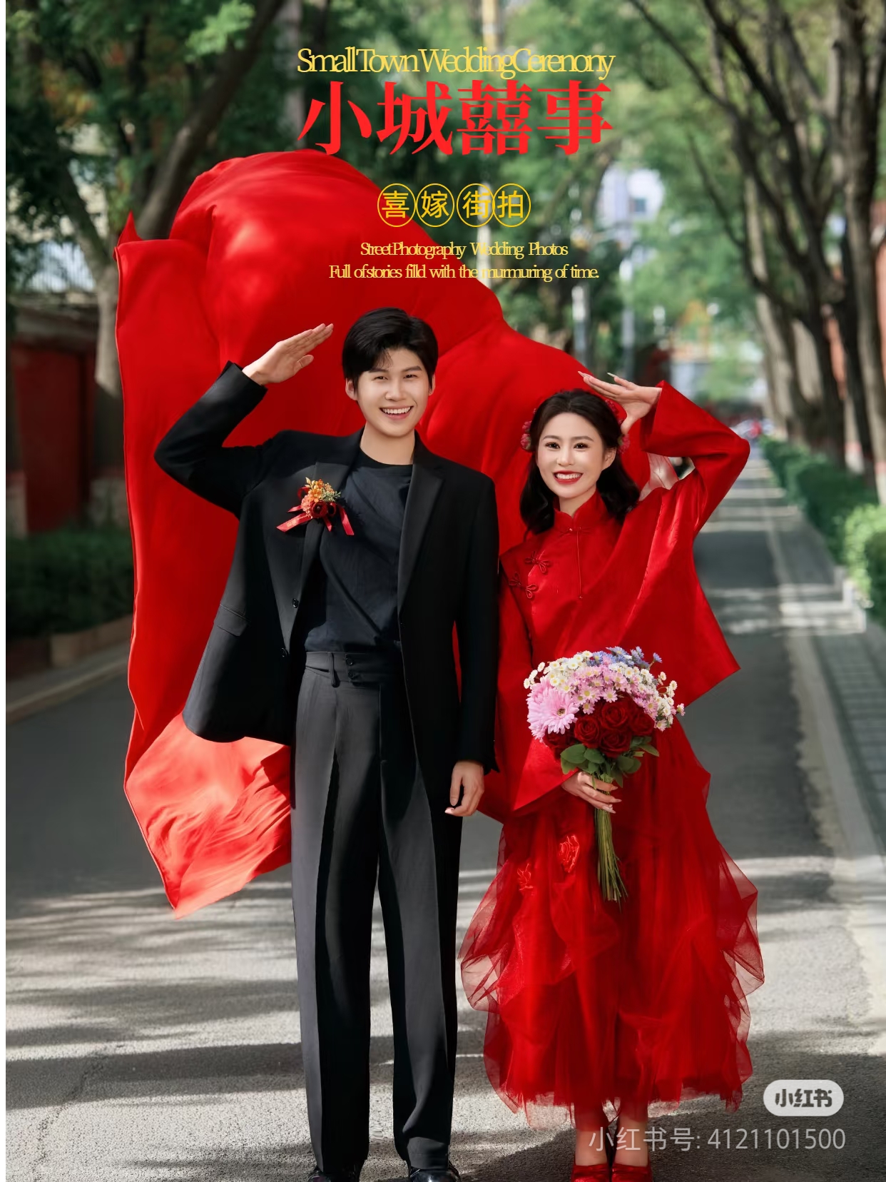 可以准备 假手捧花 头纱 囍字(建议新人可以自行准备 鲜花拍摄)